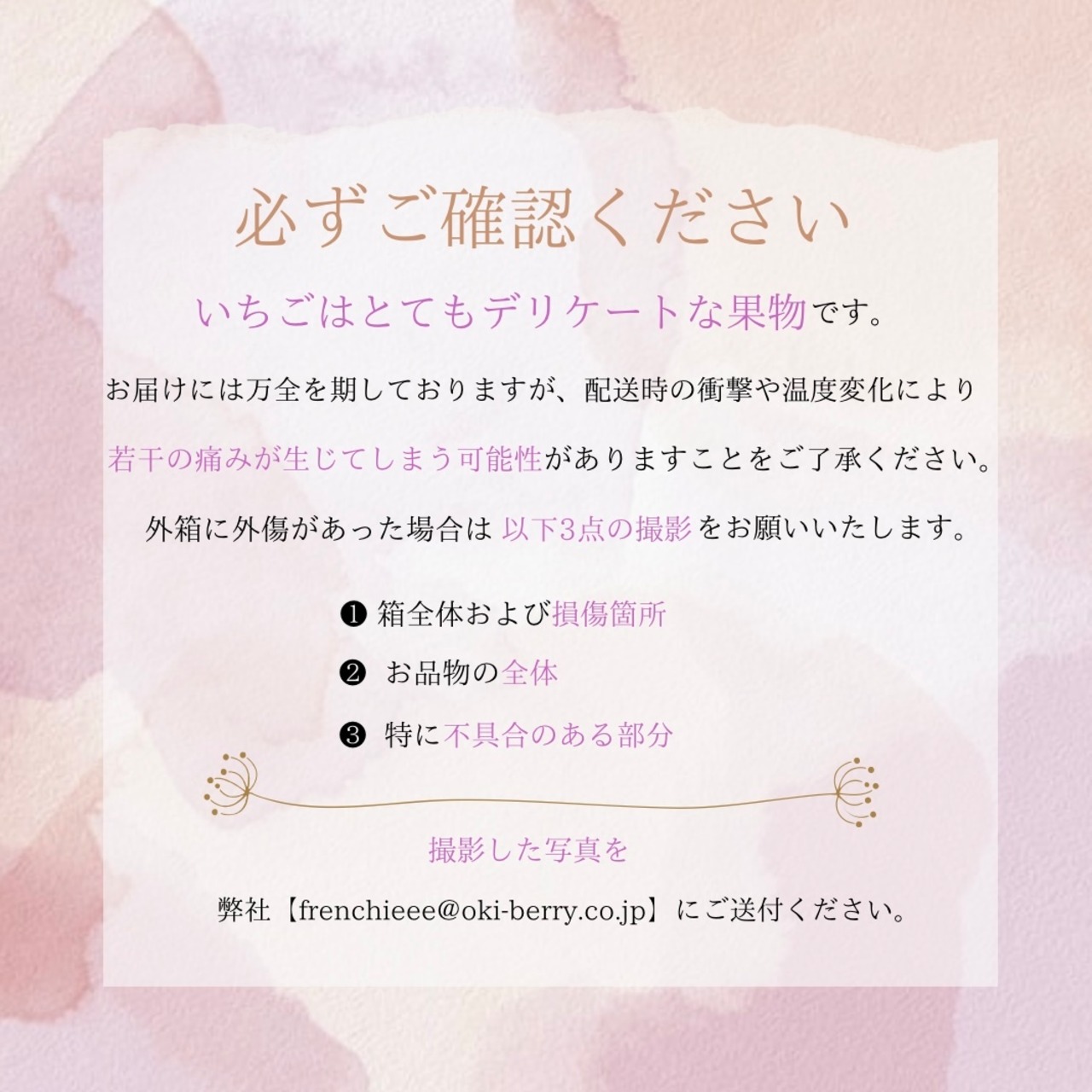 商品について:いちごはとてもデリケートな果物です。お届けには万全を期しておりますが、配送時の衝撃や温度変化により若干の痛みが生じてしまう可能性がありますことをご了承ください。